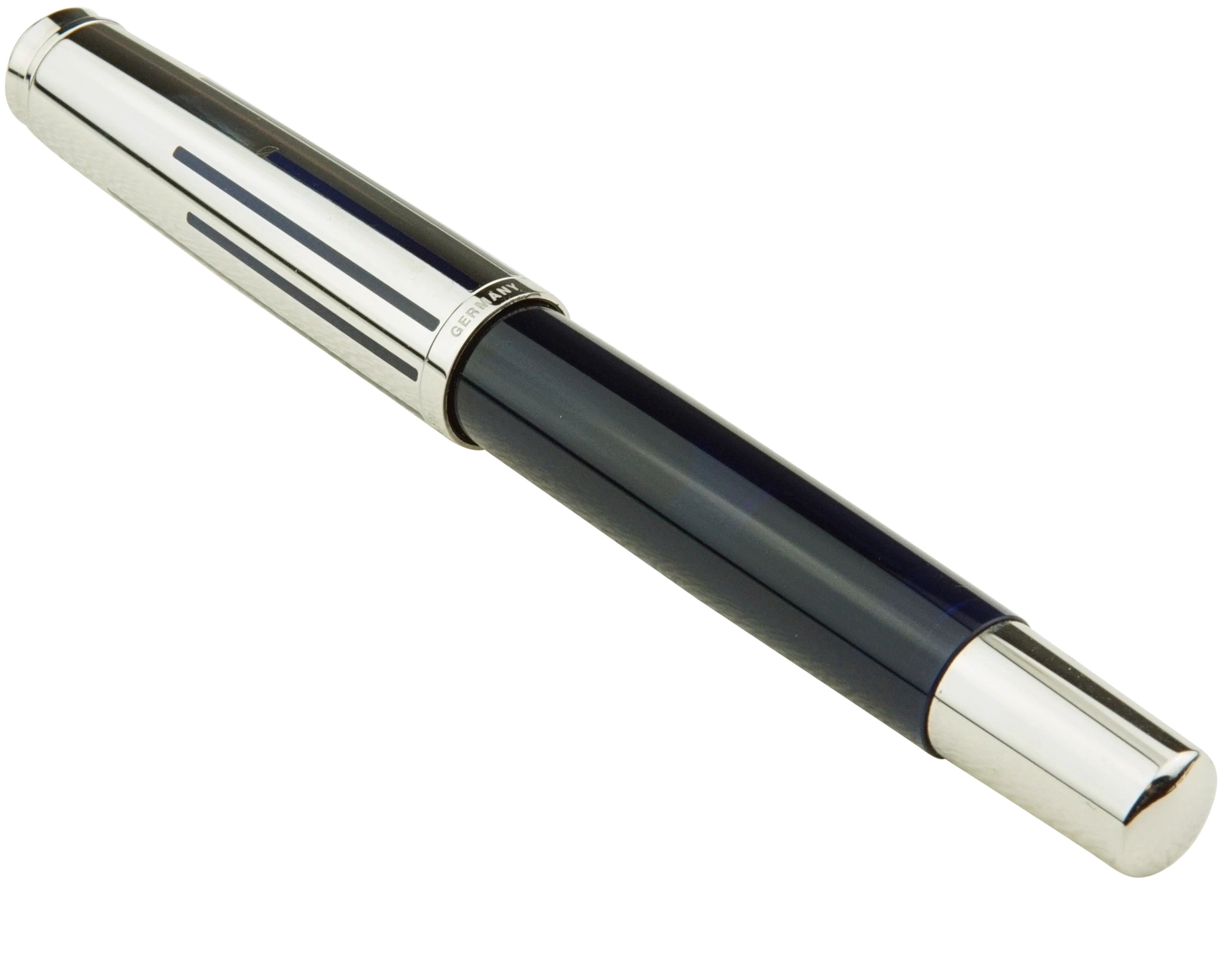 Gefertigt aus dunkelblauem Edelharz und kombiniert mit einer Kappe aus 925er Sterlingsilber, die durch dunkelblaue Streifen-Intarsien veredelt wurde, vereint dieses Schreibgerät klassische Materialien mit moderner Gestaltung. Details aus Stainless Steel, darunter der in Form eines Pelikanschnabels geformte Clip, setzen dezente Akzente und runden das Erscheinungsbild harmonisch ab.