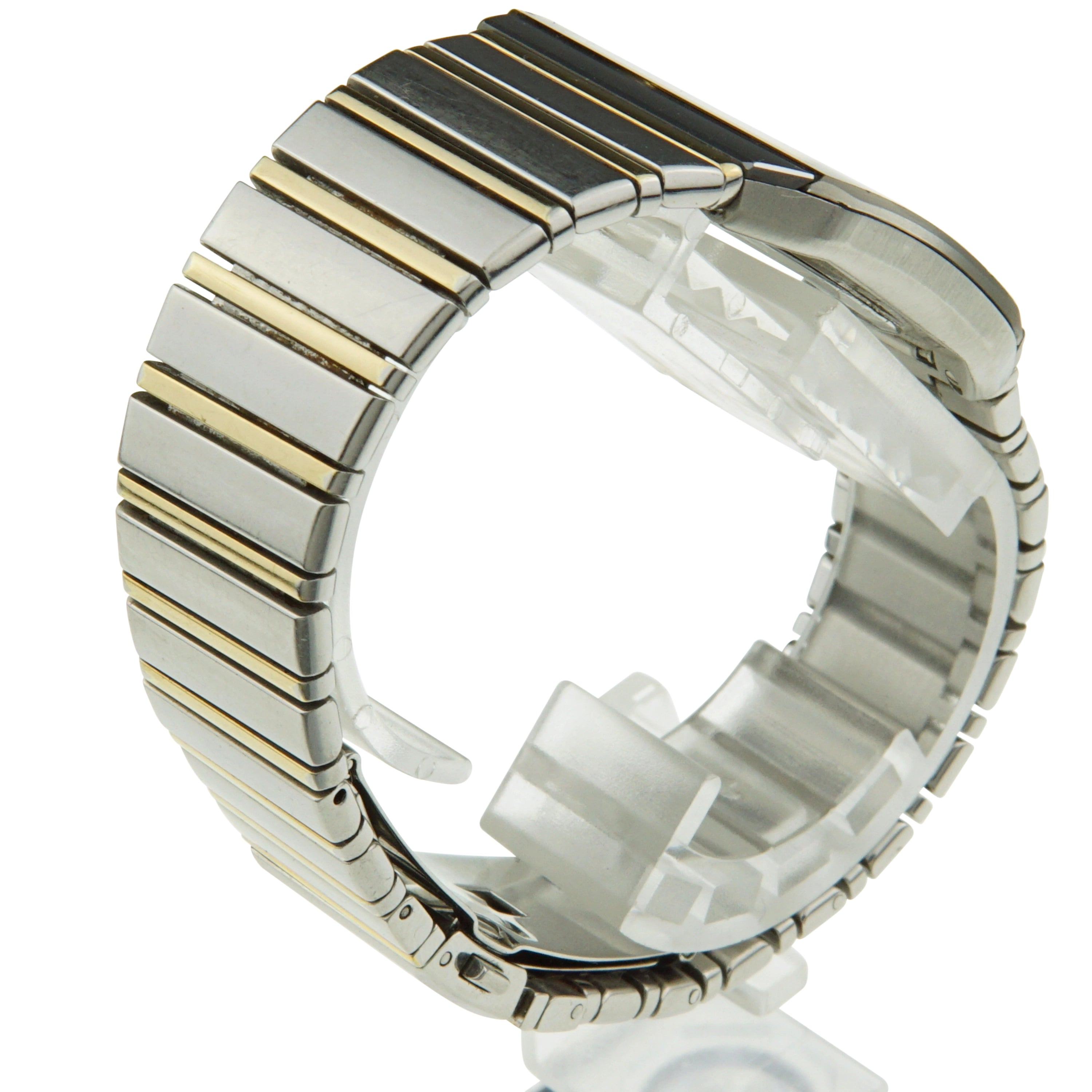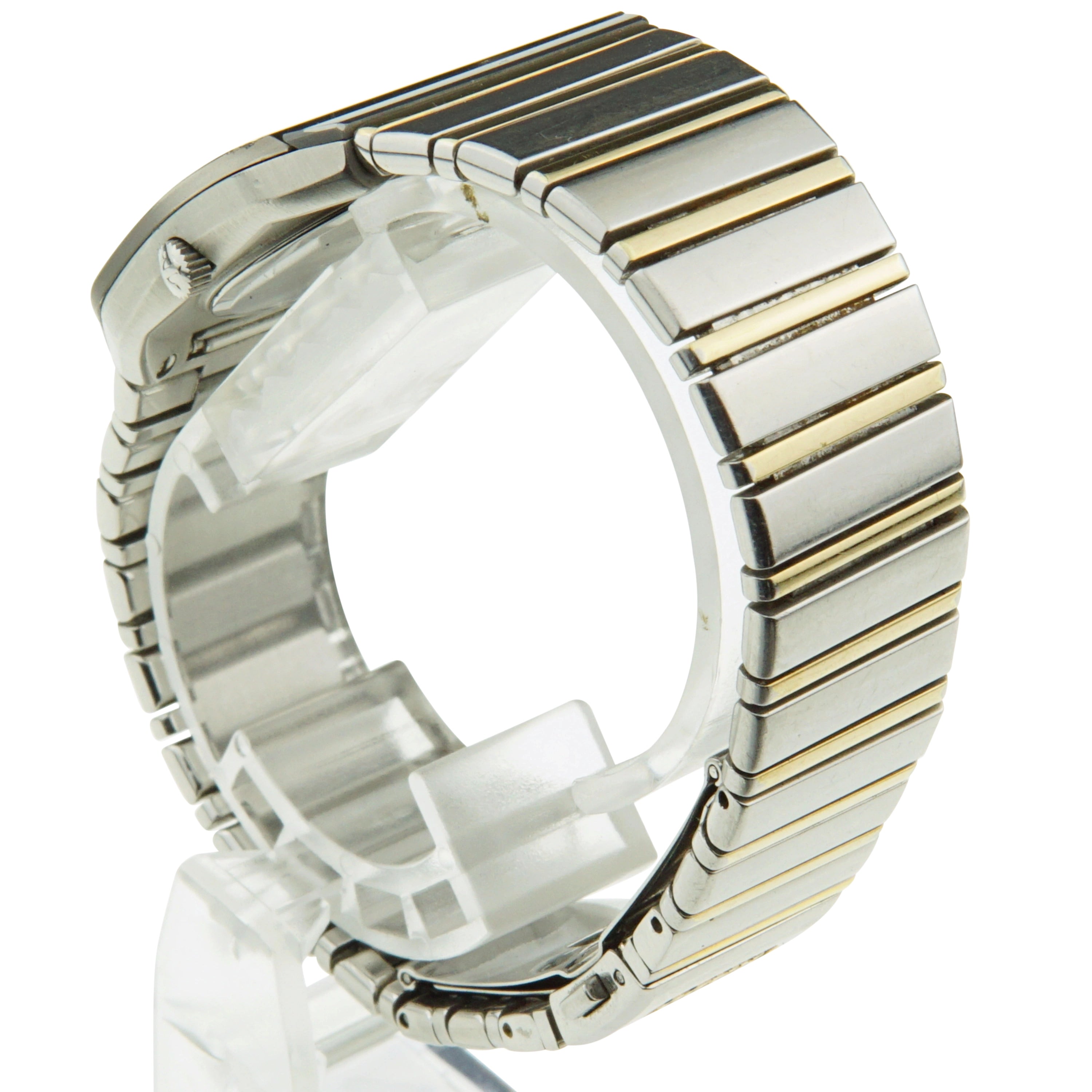 Das rechteckige Edelstahlgehäuse wirkt in seiner schmalen Bauweise sehr elegant am Handgelenk. Gleichzeitig wurde durch die Verwendung eines integrierten, vorgesetzten Glaselements ein futuristisches Designkonzept verwirklicht. Das integrierte, sportliche Stahlarmband besitzt goldfarbenen Akzente und gibt der Uhr ein exklusive und luxuriöse Note.