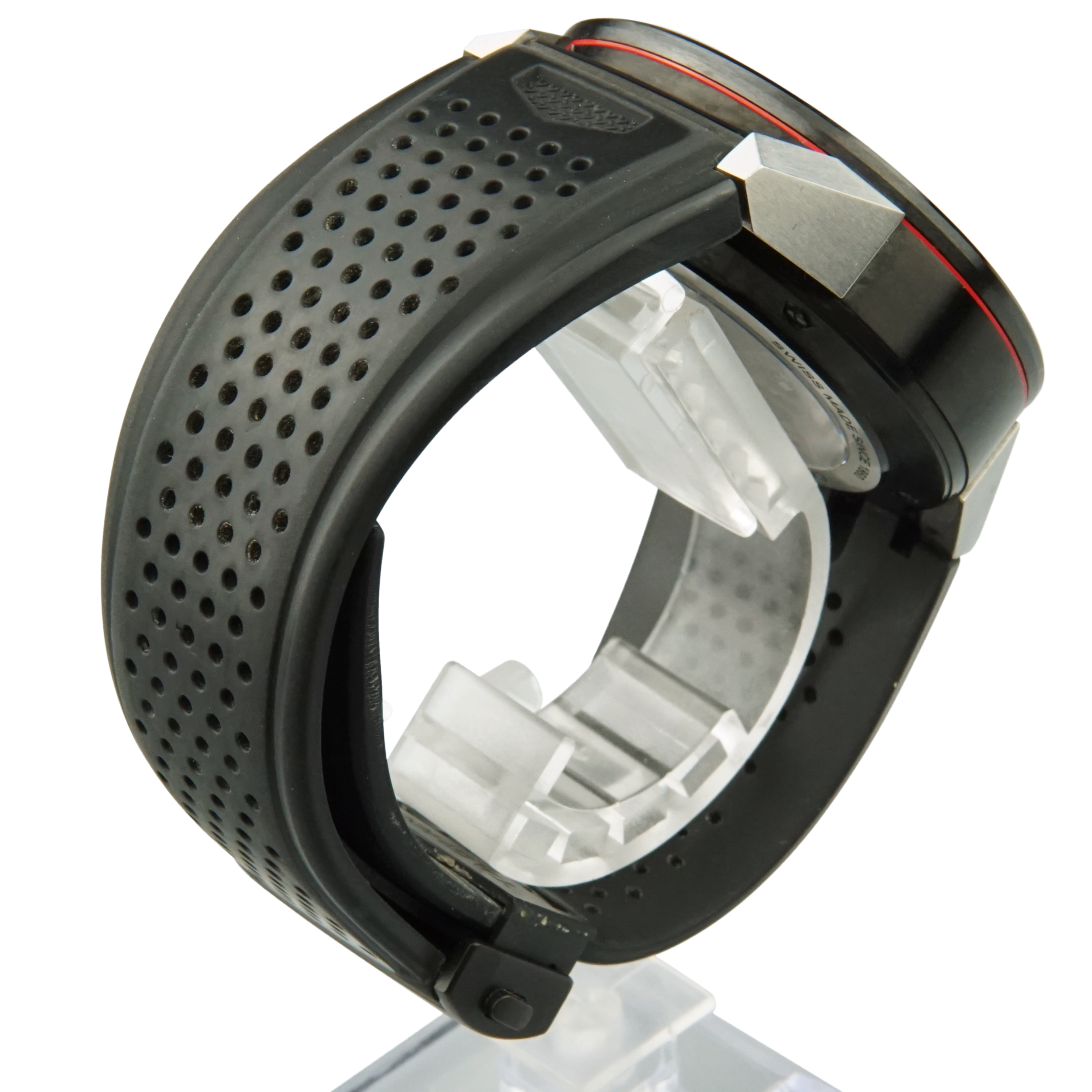 Die TAG Heuer Carrera Calibre HEUER 01 Ref. CAR2A1Z ist ein moderner Chronograph mit einem auffälligen 45mm-Edelstahlgehäuse und schwarzer PVD-Beschichtung. Das skelettierte Zifferblatt gewährt einen faszinierenden Blick auf das hauseigene Calibre HEUER 01 Automatikwerk mit 50 Stunden Gangreserve. Mit einer schwarzen Keramiklünette, Tachymeterskala und einem transparenten Gehäuseboden kombiniert sie sportliche Eleganz mit innovativer Technik. Das Modell ist bis 100 Meter wasserdicht und kommt auf einem sportlichen mit Kautschukband.